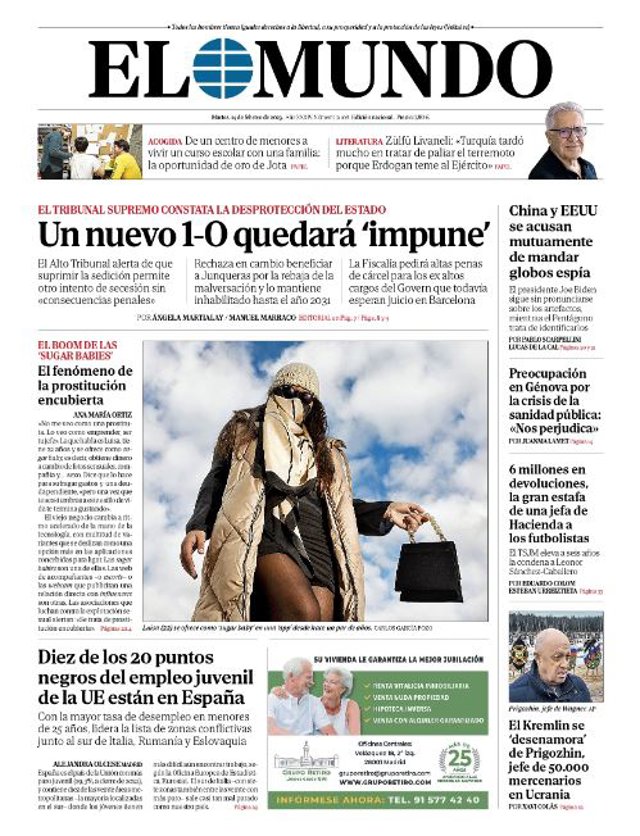 EL MUNDO: "El nuevo 1-O quedará impune"; "El fenómeno de la prostitución encubierta"; "Diez de los 20 puntos negros del empleo juvenil de la UE están en España"; "China y EEUU se acusan mutuamente de mandar globos espía"; "Preocupación en Génova por la crisis de la sanidad pública: Nos perjudica"; "6 millones en devoluciones, la gran estafa de una jefa de Hacienda a los futbolistas"; "El Kremlim se desenamora de Prigozhin, jefe de 50.000 mercenarios de Ucrania".