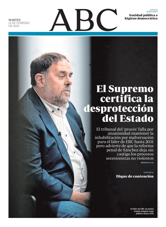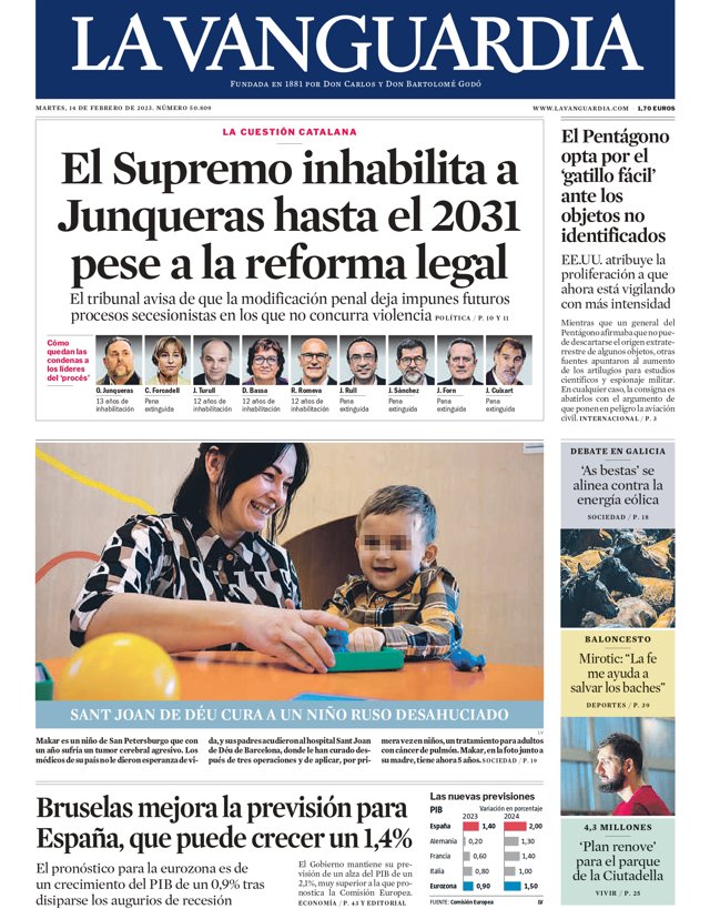 LA VANGUARDIA: "El Supremo inhabilita a Junqueras hasta el 2031 pese a la reforma legal"; "El Pentágono opta por el 'gatillo fácil' ante los objetos no identificados"; "Sant Joan de Déu cura a un niño ruso desahuciado"; "Bruselas mejora la previsión para España, que puede crecer un 1,4%".