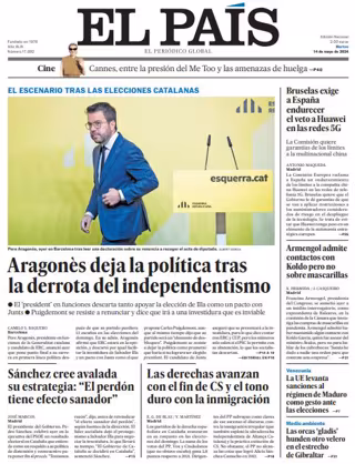 EL PAÍS: "Aragonès deja la política tras la derrota del independentismo"; "Sánchez cree avalada su estrategia: "El perdón tiene efecto sanador""; "Las derechas avanzan con el fin de CS y el tono duro con la inmigración"; "Bruselas exige a España endurecer el veto a Huawei en las redes 5G"; "Armengol admite contactos con Koldo pero no sobre mascarillas"; "La UE levanta sanciones al régimen de Maduro como gesto ante las elecciones"; "Las orcas 'gladis' hunden otro velero en el estrecho de Gibraltar".