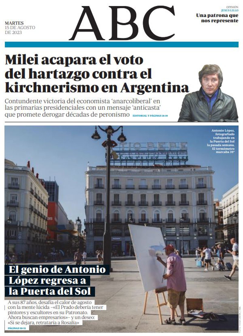 ABC: "Milei acapara el voto del hartazgo contra el kirchnerismo en Argentina. Contundente victoria del economista 'anarcoliberal' en las primarias presidenciales con un mensaje 'anticasta' que promete derogar décadas de peronismo"; "El genio de Antonio López regresa a la Puerta del Sol. A sus 87 años, desafía el calor de agosto con la mente lúcida -"El Prado debería tener pintores y escultores en su Patronato. Ahora buscan empresarios"- y un deseo: "Si se dejara, retrataría a Rosalía"".