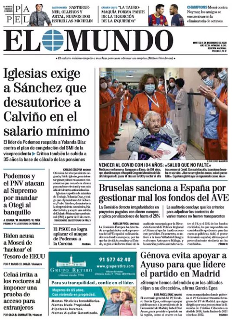 EL MUNDO: "Iglesias exige a Sánchez que desautorice a Calviño en el salario mínimo"; "Bruselas sanciona a España por gestionar mal los fondos del AVE"; "Génova evita apoyar a Ayuso para que lidere el partido en Madrid"; "Podemos y el PNV atacan al Supremo por mandar a Otegi al banquillo"; "Biden acusa a Moscú de 'hackear' el Tesoro de EEUU"; "Celaá irrita a los rectores al imponer una prueba de acceso para extranjeros"; "El PSOE no logra aplacar el ataque de Podemos a la Corona".