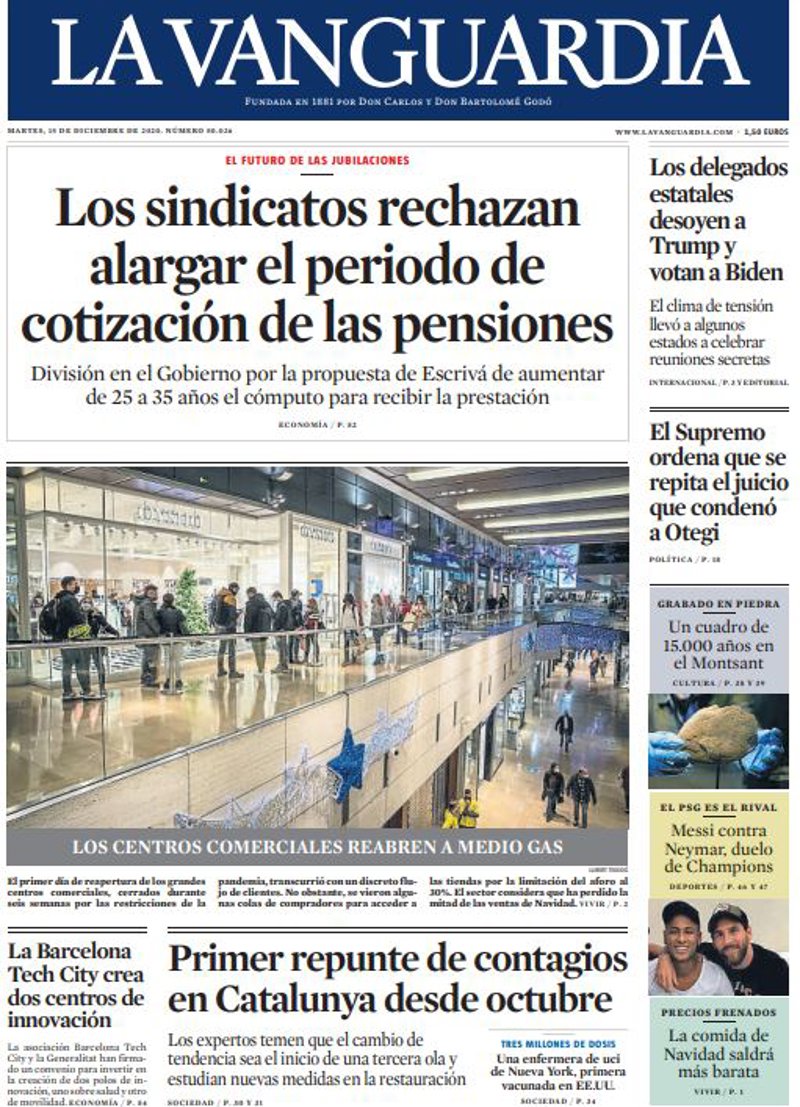 LA VANGUARDIA: "Los sindicatos rechazan alargar el periodo de cotización de las pensiones"; "Primer repunte de contagios en Catalunya desde octubre"; "La Barcelona Tech City crea dos centros de innovación"; "Los delegados estatales desoyen a Trump y votan a Biden"; "El Supremo ordena que se repita el juicio que condenó a Otegi".