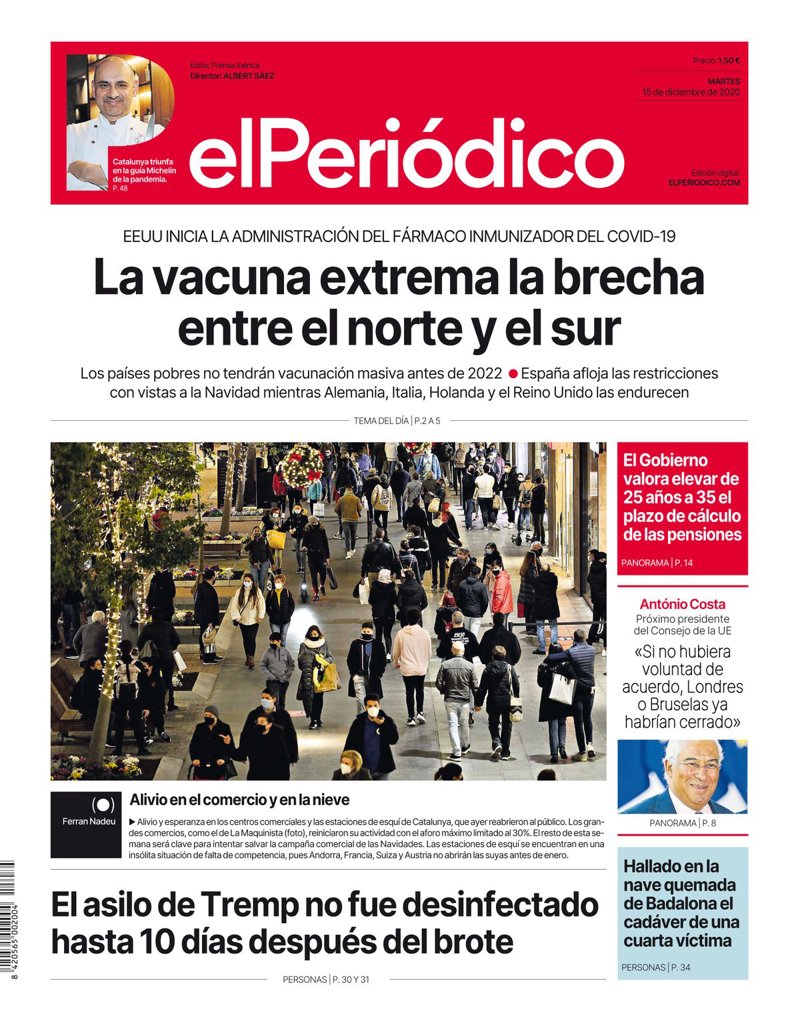 EL PERIÓDICO: "La vacuna extrema la brecha entre el norte y el sur"; "El Gobierno valora elevar de 25 años a 35 el plazo de cálculo de las pensiones"; "El asilo de Tremp no fue desinfectado hasta 10 días después del brote"; "António Costa, próximo presidente del Consejo de la UE: "Si no hubiera voluntad de acuerdo, Londres o Bruselas ya habrían cerrado""; "Hallado en la nave quemada de Badalona el cadáver de una cuarta víctima".