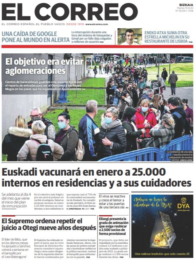 EL CORREO: "Euskadi vacunará en enero a 25.000 internos en residencias y a sus cuidadores"; "El Supremo ordena repetir el juicio a Otegi nueve años después"; "Elizegi presenta la grada de animación que exige reubicar a 2.500 socios de forma provisional".