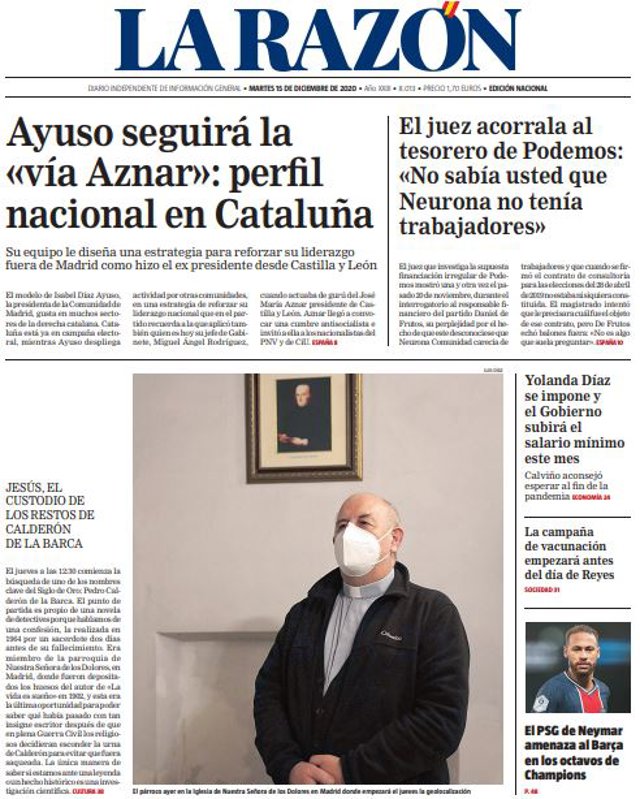 LA RAZÓN: "Ayuso seguirá la "vía Aznar": perfil nacional en Cataluña"; "El juez acorrala al tesorero de Podemos: "No sabía usted que Neurona no tenía trabajadores""; "Yolanda Díaz se impone y el Gobierno subirá el salario mínimo este mes"; "La campaña de vacunación empezará antes del día de Reyes".