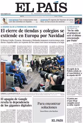 EL PAÍS: "El cierre de tiendas y colegios se extiende en Europa por Navidad"; "El apagón de Google revela la dependencia de los gigantes digitales"; "Alezxéi Navalni, líder opositor ruso: "No he sido el primero ni seré el último envenenado por Putin""; "El exjefe de la Policía señala en el 'caso Kitchen' a la cúpula del PP"; "El juicio por el que Otegi cumplió cárcel se debe repetir".