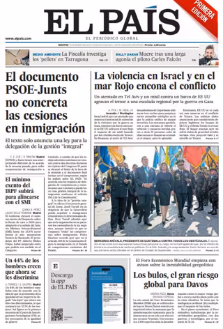 EL PAÍS: "El documento PSOE-Junts no concreta las cesiones en inmigración"; "El mínimo exento del IRPF subirá para alinearse con el SMI"; "Un 44% de los hombres creen que ahora se les discrimina"; "La violencia en Israel y en el mar Rojo encona el conflicto"; "Los bulos, el gran riesgo global para Davos".