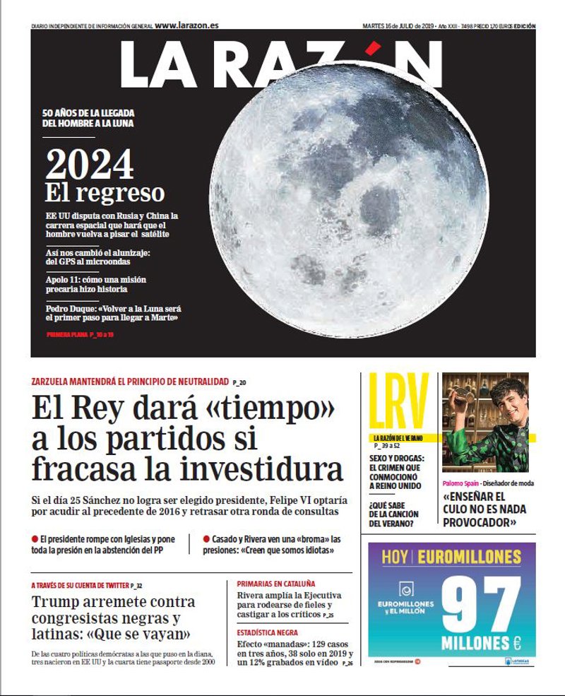 LA RAZÓN: "50 años de la llega del hombre a la Luna. 2024 El regreso. EE UU disputa con Rusia y China la carrera espacial que hará que el hombre vuelva a pisar el satélite"; "El Rey dará "tiempo" a los partidos si fracasa la investidura"; "Trump arremete contra congresistas negras y latinas: "Que se vayan""; "Rivera amplía la Ejecutiva para rodearse de fieles y castigar a los críticos"; "Efecto "manadas": 129 casos en tres años, 38 solo en 2019 y un 12% grabados en vídeo".