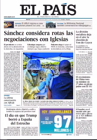 EL PAÍS: "Sánchez considera rotas las negociaciones con Iglesias"; "El Ébola sigue su avance y alcanza una gran ciudad de Congo"; "La división socialista deja en el aire la elección de Von der Leyen"; "El crecimiento de China toca su mínimo en 27 años en pleno pulso con EE UU"; "El hambre en el mundo sube por tercer año y afecta ya a 821 millones de personas"; "El día en que Trump borró a España del Estrecho. Washington obvió a Madrid y confió a Londres la captura del petrolero iraní".