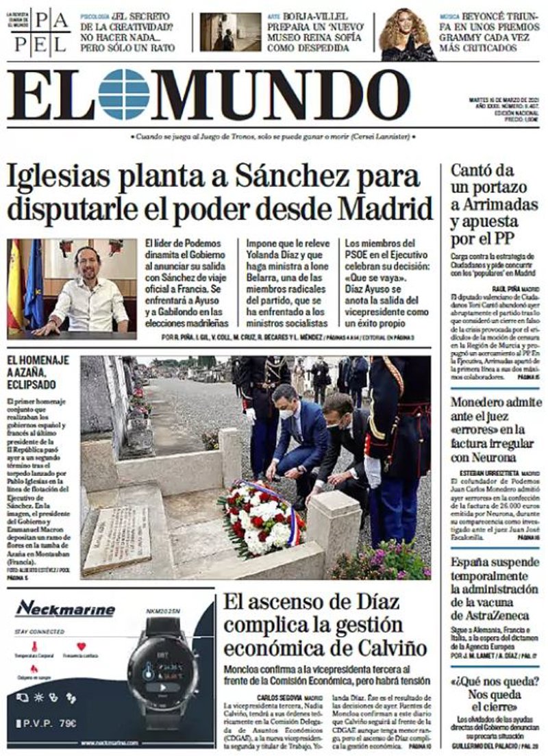 EL MUNDO: "Iglesias planta a Sánchez para disputarle el poder desde Madrid"; "El homenaje a Azaña, eclipsado"; "El ascenso de Díaz complica la gestión económica de Calviño"; "Cantó da un portazo a Arrimadas y apuesta por el PP"; "Monedero admite ante el juez "errores" en la factura irregular con Neurona"; "España suspende temporalmente la administración de la vacuna de AstraZeneca".