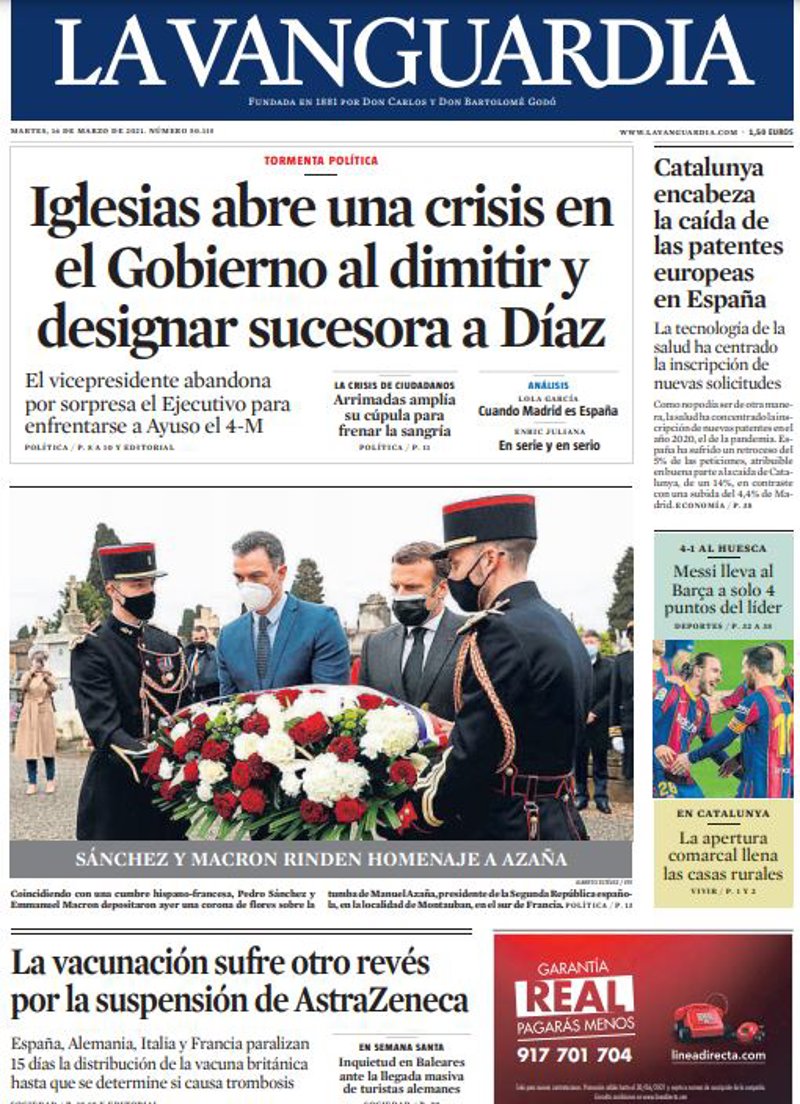 LA VANGUARDIA: "Iglesias abre una crisis en el Gobierno al dimitir y designar sucesora a Díaz"; "La vacunación sufre otro revés por la suspensión de AstraZeneca"; "Catalunya encabeza la caída de las patentes europeas en España".