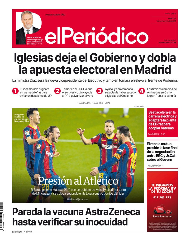 EL PERIÓDICO: "Iglesias deja el Gobierno y dobla la apuesta electoral en Madrid"; "Parada la vacuna AstraZeneca hasta verificar su inocuidad"; "Seat acelera en la carrera eléctrica y adaptará la planta de El Prat para acoplar baterías"; "El recelo mutuo preside la fase final entre ERC y JxCat sobre el Govern".