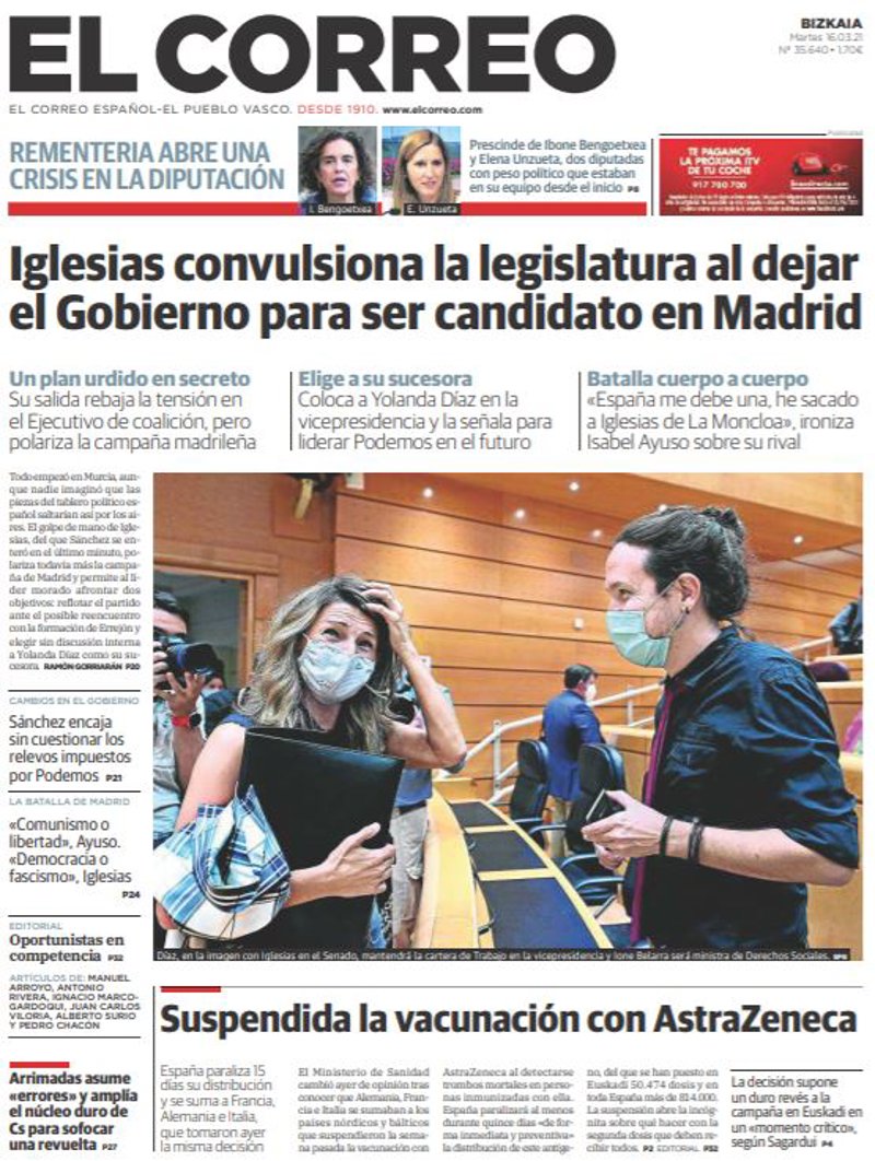 EL CORREO: "Iglesias convulsiona la legislatura al dejar el Gobierno para ser candidato en Madrid"; "Suspendida la vacunación con AstraZeneca"; "Arrimadas asume "errores" y amplía el núcleo duro de Cs para sofocar una revuelta".