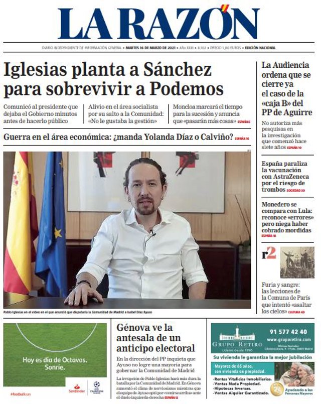 LA RAZÓN: "Iglesias planta a Sánchez para sobrevivir a Podemos"; "Guerra en el área económica: ¿manda Yolanda Díaz o Calviño?"; "Génova ve la antesala de un anticipo electoral"; "La Audiencia ordena que se cierre ya el caso de la "caja B" del PP de Aguirre"; "España paraliza la vacunación con AstraZeneca por el riesgo de trombos"; "Monedero se compara con Lula: reconoce "errores" pero niega haber cobrado mordidas".