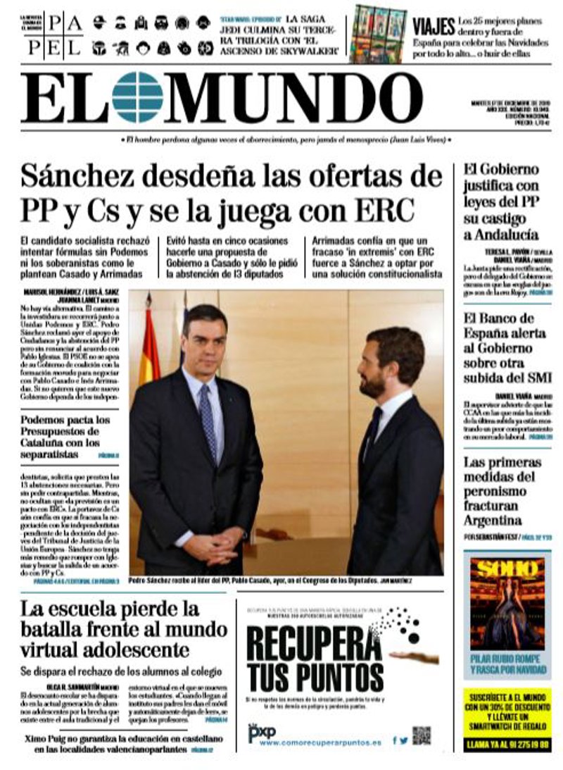 EL MUNDO: "Sánchez desdeña las ofertas de PP y Cs y se la juega a ERC"; "La escuela pierde la batalla frente al mundo virtual adolescente"; "El Gobierno justifica con leyes del PP su castigo a Andalucía"; "El Banco de España alerta al Gobierno sobre otra subida del SMI"; "Las primeras medidas del peronismo fracturan a Argentina".