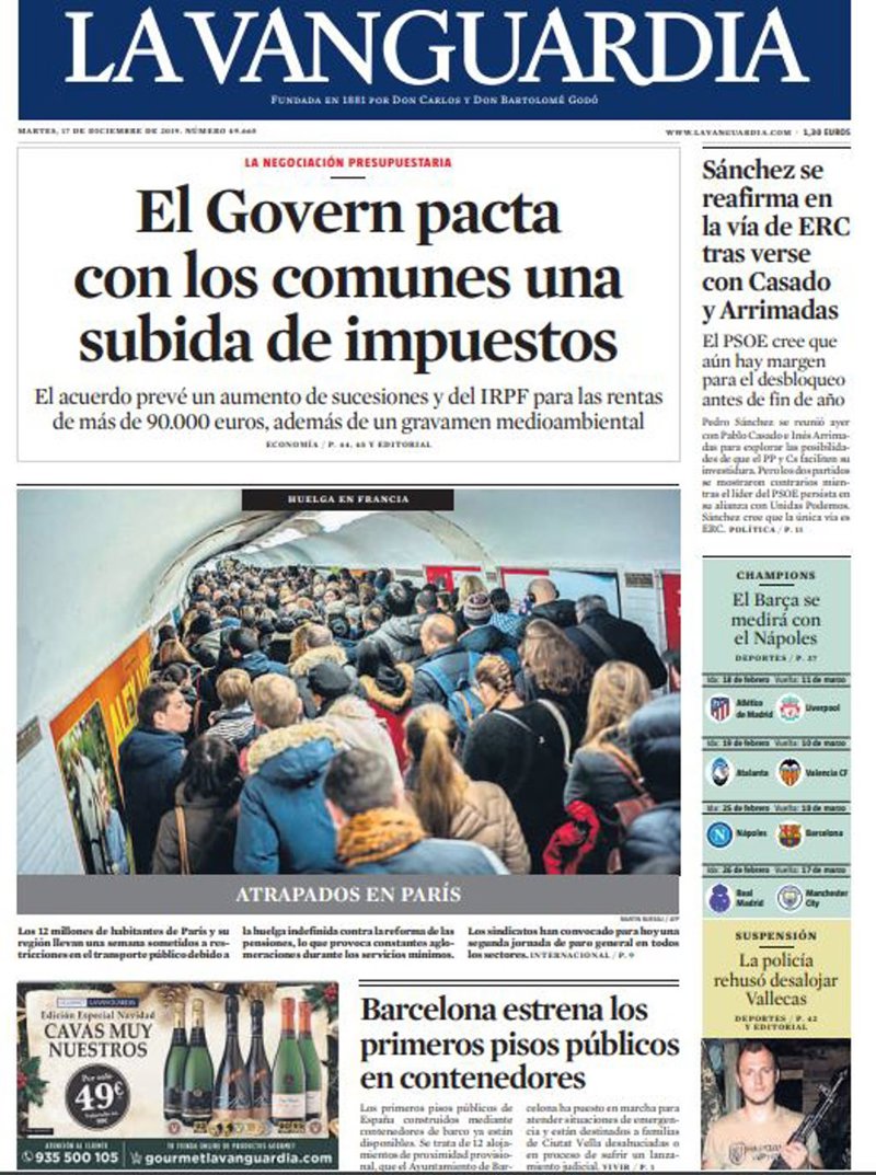 LA VANGUARDIA: "El Govern pacta con los comunes una subida de impuestos"; "Sánchez se reafirma en la vía de ERC tras verse con Casado y Arrimadas"; "Barcelona estrena los primeros pisos públicos en contenedores".