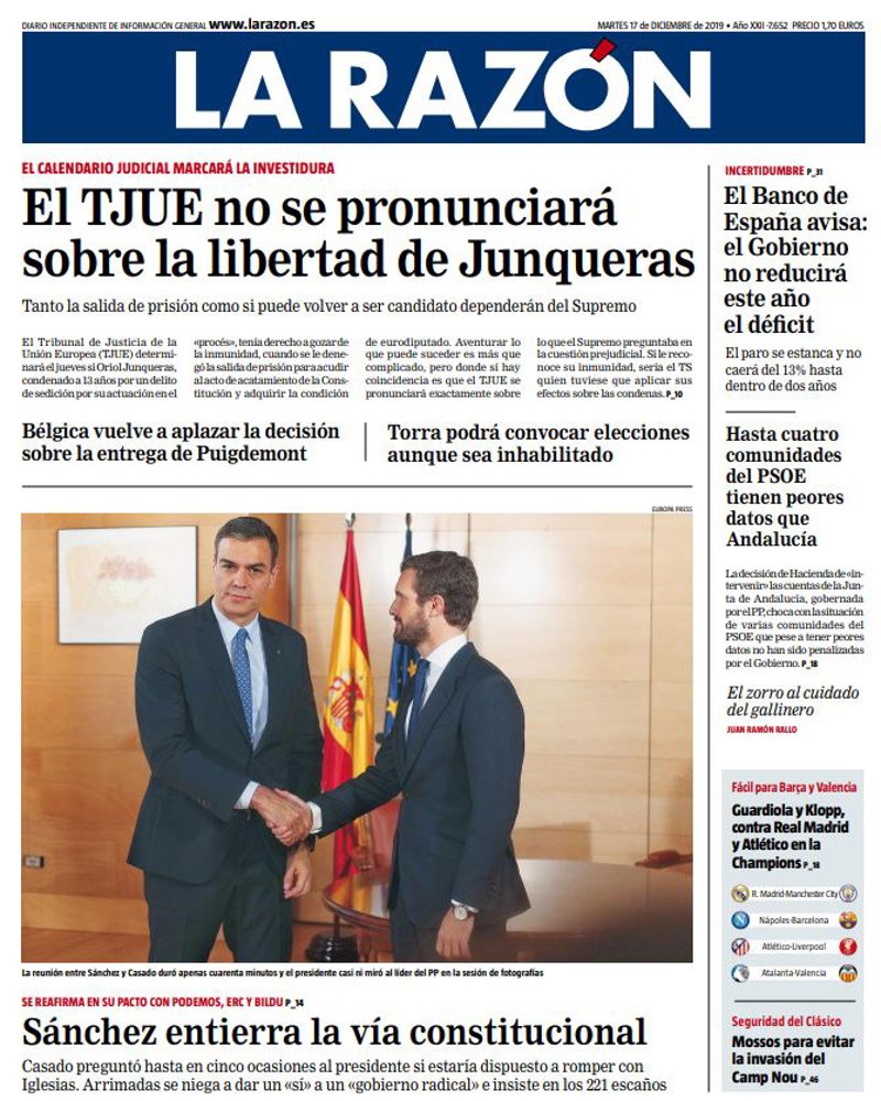 LA RAZÓN: "El TJUE no se pronunciará sobre la libertad de Junqueras"; "Sánchez entierra la vía constitucional"; "El Banco de España avisa: el Gobierno no reducirá este año el déficit"; "Hasta cuatro comunidades del PSOE tienen peores datos que Andalucía".