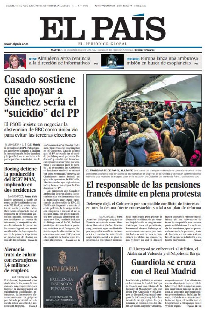 EL PAÍS: "Casado sostiene que apoyar a Sánchez sería el 'suicidio' del PP"; "El responsable de las pensiones francesas dimite en plena protestas"; "Boeing detiene la producción del B737 MAX, implicado en dos accidentes"; "Alemania trata de cubrir con extranjeros 1,4 millones de empleos"; "Guardiola se cruza con el Real Madrid".