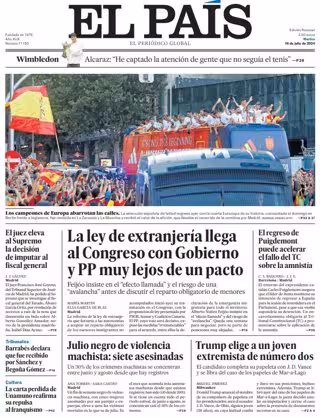 EL PAÍS: "La ley de extranjería llega al Congreso con Gobierno y PP muy lejos de un pacto"; "Julio negro de violencia machista: siete asesinadas"; "Trump elige a un joven extremista de número dos"; "El regreso de Puigdemont puede acelerar el fallo del TC sobre la amnistía"; "El juez eleva al Supremo la decisión de imputar al fiscal general"; "Barrabés declara que fue recibido por Sánchez y Begoña Gómez"; "La carta perdida de Unamuno reafirma su repulsa al franquismo".