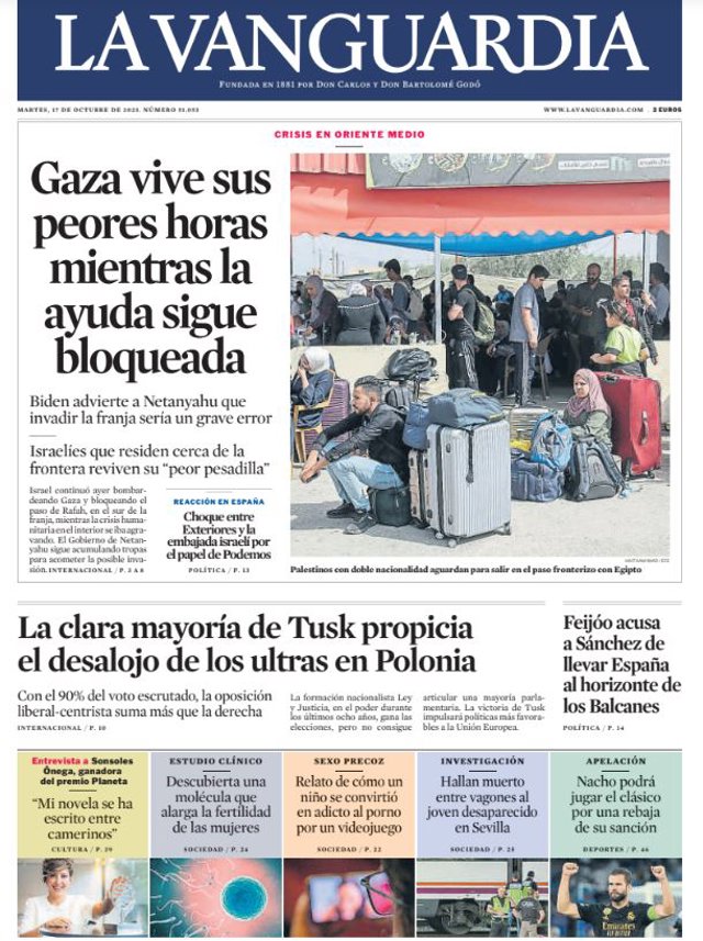 EL PAÍS: "El bloqueo de Gaza deja los hospitales al borde del colapso"; "Rafah tiene la llave del éxodo y de la ayuda"; "El hijo del empresario más rico de Ecuador gana las elecciones"; "Las urnas refrendan el fin de la era conservadora en Polonia"; "Hallado muerto