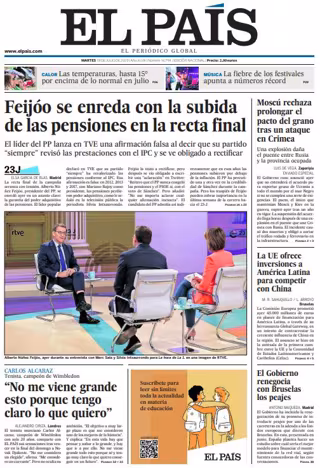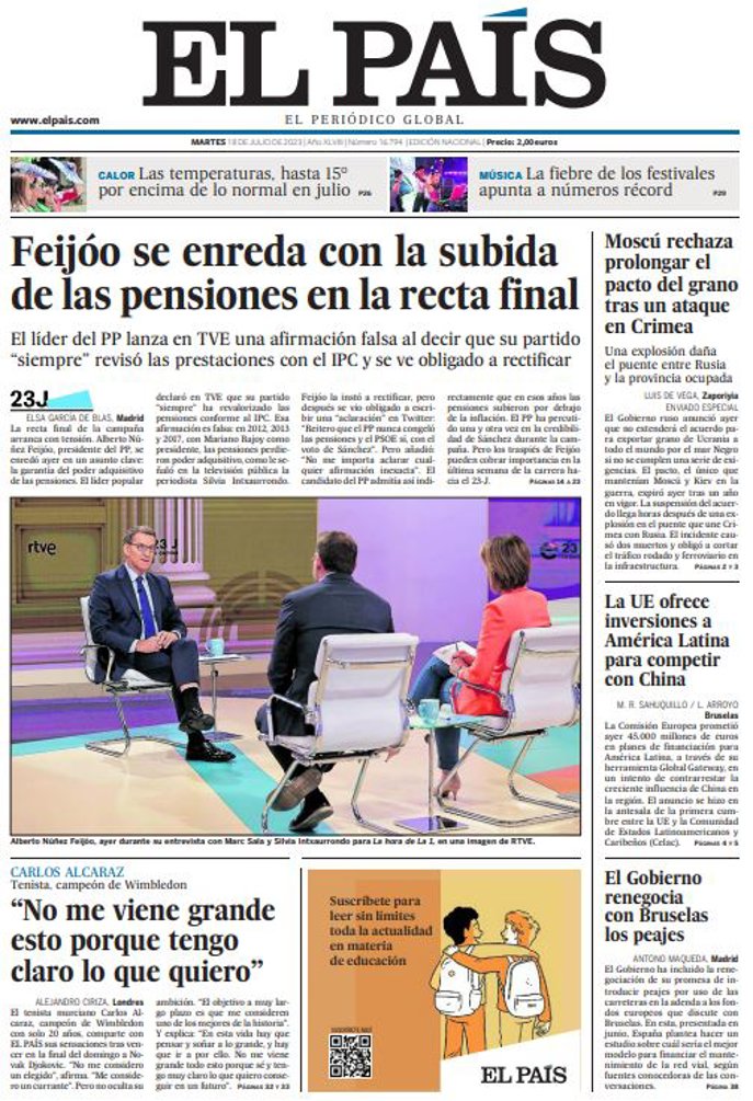 EL PAÍS: "Feijóo se enreda con la subida de las pensiones en la recta final"; "Carlos Alcaraz, tenista, campeón de Wimbledon: "No me viene grande esto porque tengo claro lo que quiero""; "Moscú rechaza prolongar el pacto del grano tras un ataque en Crimea"; "La UE ofrece inversiones a América Latina para competir con China"; "El Gobierno renegocia con Bruselas los peajes".