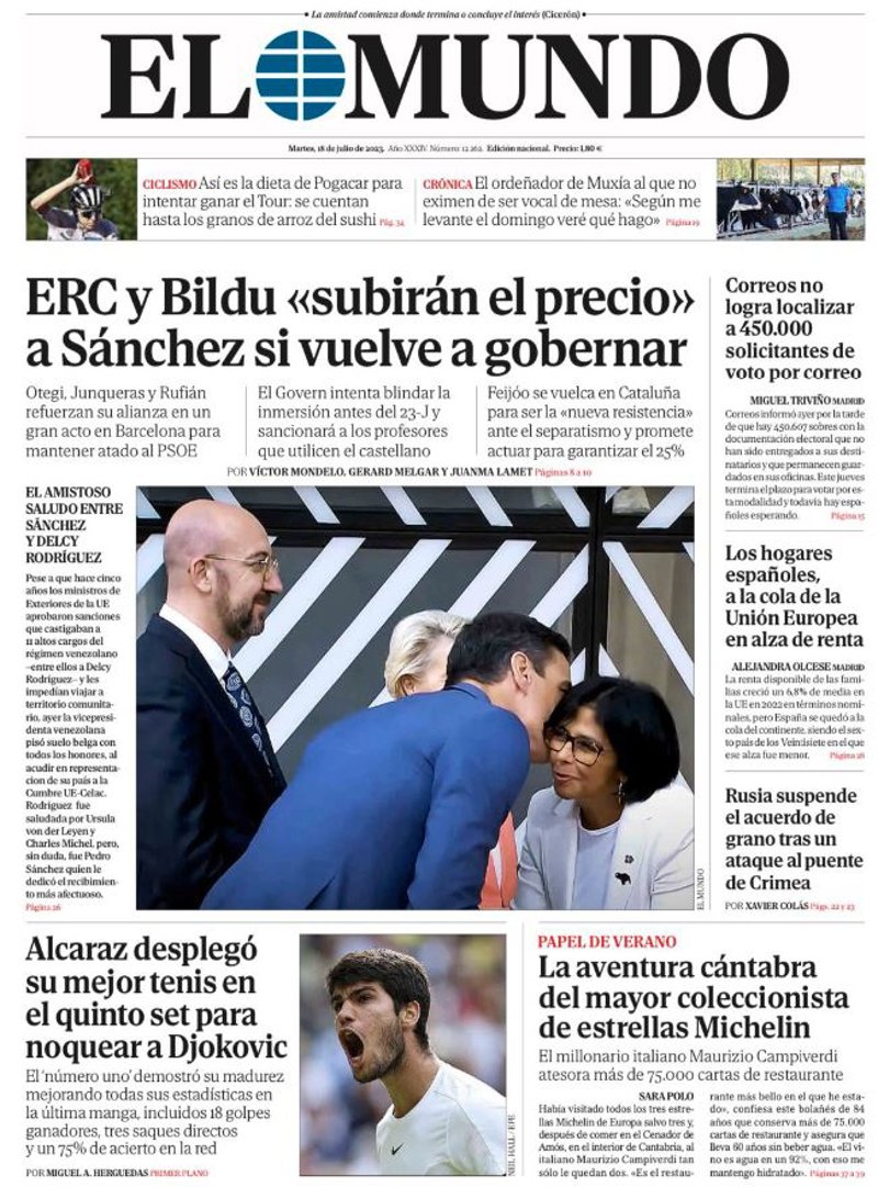 EL MUNDO: "ERC y Bildu "subirán el precio" a Sánchez si vuelve a gobernar"; "Alcaraz desplegó su mejor tenis en el quinto set para noquear a Djokovic"; "Correos no logra localizar a 450.000 solicitantes por correo"; "Los hogares españoles, a la cola de la Unión Europea en alza de renta"; "Rusia suspende el acuerdo de grano tras un ataque al puente de Crimea"; "La aventura cántabra del mayor coleccionista de estrellas Michelin".