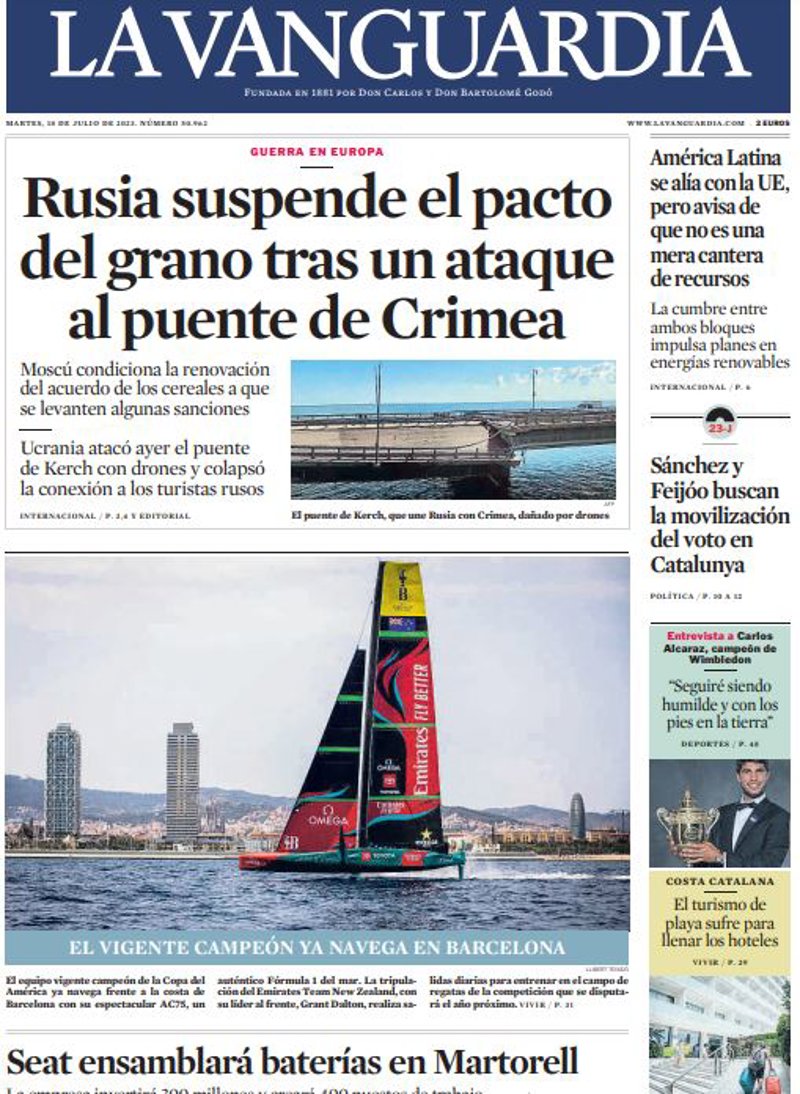 LA VANGUARDIA: "Rusia suspende el pacto del grano tras un ataque al puente de Crimea"; "Seat ensamblará baterías en Martorell"; "América Latina se alía con la UE, pero avisa de que no es una mera cantera de recursos"; "Sánchez y Feijóo buscan la movilización del voto en Catalunya".