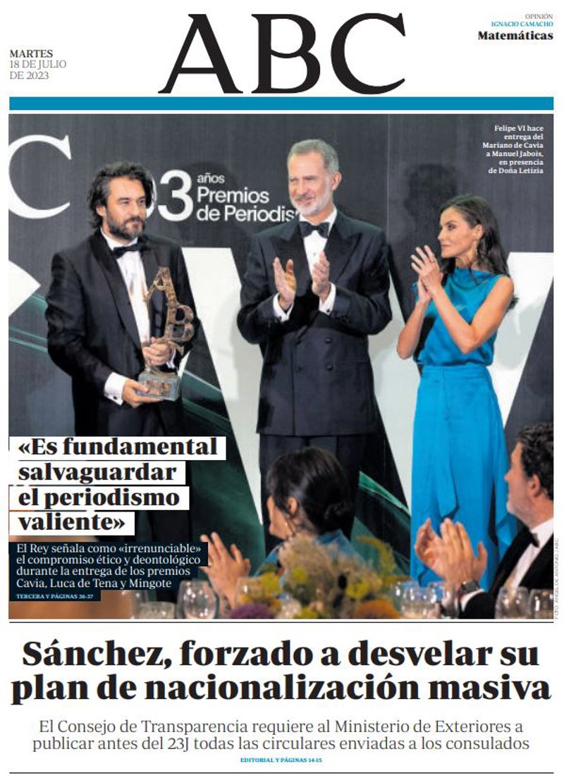 ABC: "Sánchez, forzado a desvelar su plan de nacionalización masiva. El Consejo de Transparencia requiere al Ministerio de Exteriores a publicar antes del 23J todas las circulares enviadas a los consulados"; ""Es fundamental salvaguardar el periodismo valiente". El Rey señala como "irrenunciable" el compromiso ético y deontológico durante la entrega de los premios Cavia, Luca de Tena y Mingote".