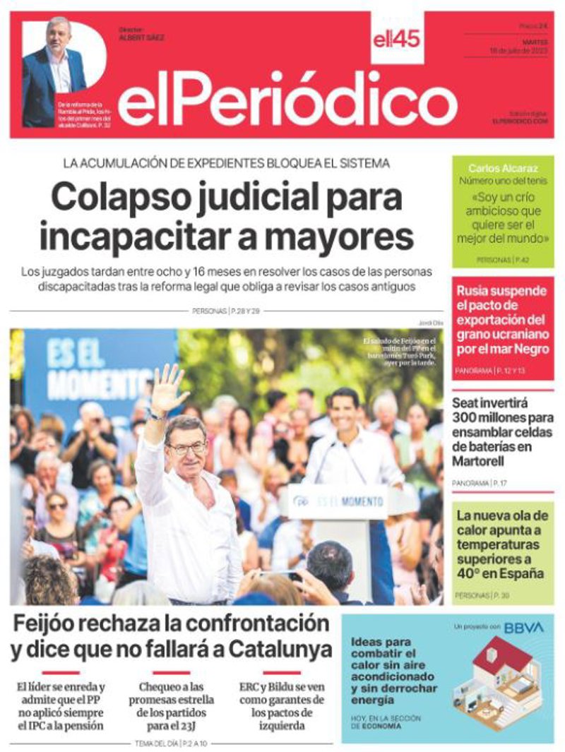 EL PERIÓDICO: "Colapso judicial para incapacitar a mayores"; "Feijóo rechaza la confrontación y dice que no fallará a Catalunya"; "Carlos Alcaraz: "Soy un crío ambicioso que quiere ser el mejor del mundo""; "Rusia suspende el pacto de exportación del grano ucraniano por el mar Negro"; "Seat invertirá 300 millones para ensamblar celdas de baterías en Martorell"; "La nueva ola de calor apunta a temperaturas superiores a 40º en España".