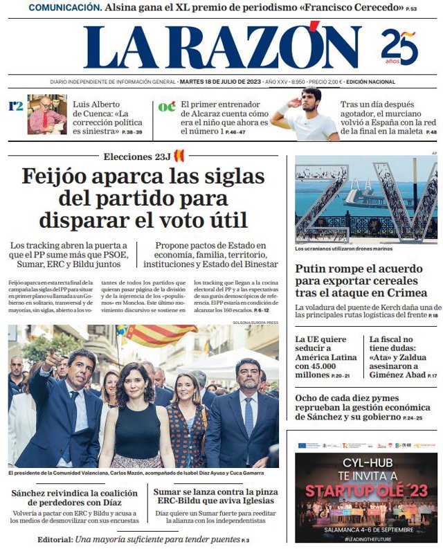 LA RAZÓN: "Feijóo aparca las siglas del partido para disparar el voto útil"; "Sánchez reivindica la coalición de perdedores con Díaz"; "Sumar se lanza contra la pinza ERC-Bildu que aviva Iglesias"; "Putin rompe el acuerdo para exportar cereales tras el ataque en Crimea"; "La UE quiere seducir a América Latina con 45.000 millones"; "La fiscal no tiene dudas: "Ata" y Zaldua asesinaron a Giménez Abad"; "Ocho de cada diez pymes reprueban la gestión económica de Sánchez y su gobierno".