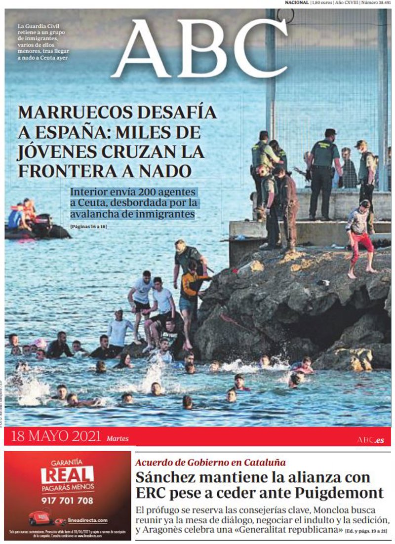 ABC: "Marruecos desafía a España: Miles de jóvenes cruzan la frontera a nado. Interior envía 200 agentes a Ceuta, desbordada por la avalancha de inmigrantes"; "Sánchez mantiene la alianza con ERC pese a ceder ante Puigdemont Acuerdo de Gobierno en Cataluña. El prófugo se reserva las consejerías clave, Moncloa busca reunir ya la mesa de diálogo, negociar el indulto y la sedición, y Aragonès celebra una "Generalitat republicana"".
