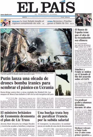 EL PAÍS: "Putin lanza una oleada de drones bomba iraníes para sembrar el pánico en Ucrania"; "El ministro británico de Economía desmonta el plan de Liz Truss"; "Una huelga trata hoy de paralizar Francia por la subida salarial"; "El Banco de España teme que el alza de la recaudación sea efímera"; "Sánchez y Feijóo se miden en el Senado al filo del acuerdo sobre el CGPJ"; "Un profesor grabó a alumnas desnudas durante 10 años"; "Mediaset relevará a Paolo Vasile tras 23 años como primer ejecutivo".