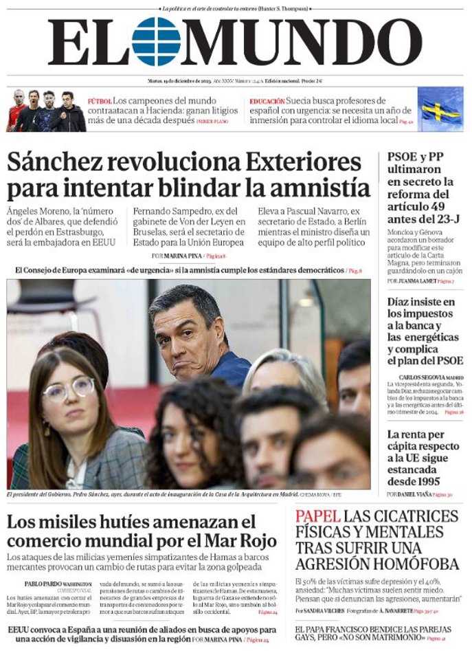 EL MUNDO: "Sánchez revoluciona Exteriores para intentar blindar la amnistía"; "Los misiles hutíes amenazan el comercio mundial por el Mar Rojo"; "PSOE y PP ultimaron en secreto la reforma del artículo 49 antes del 23J"; "Díaz insiste en los impuestos a la banca y las energéticas y complica el plan del PSOE"; "La renta per cápita respecto a la UE sigue estancada desde 1995".
