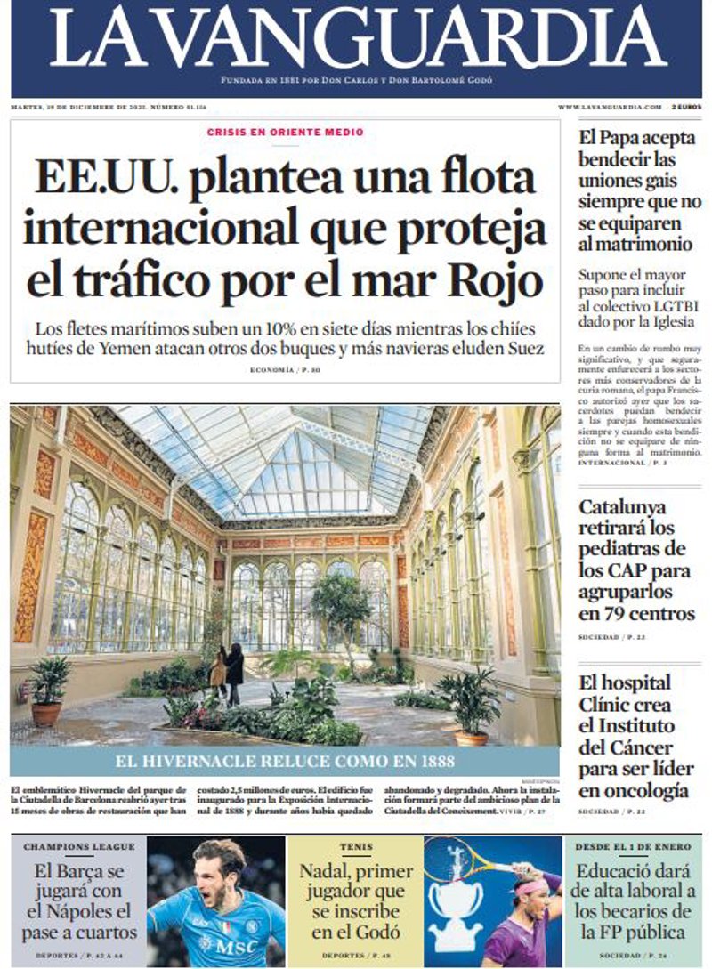 LA VANGUARDIA: "EE.UU. plantea una flota internacional que proteja eltráfico por el mar Rojo"; "El Papa acepta bendecir las uniones gais siempre que no se equiparen al matrimonio"; "Catalunya retirará los pediatras de los CAP para agruparlos en 79 centros"; "El hospital Clínic crea el Instituto del Cáncer para ser líder en oncología".