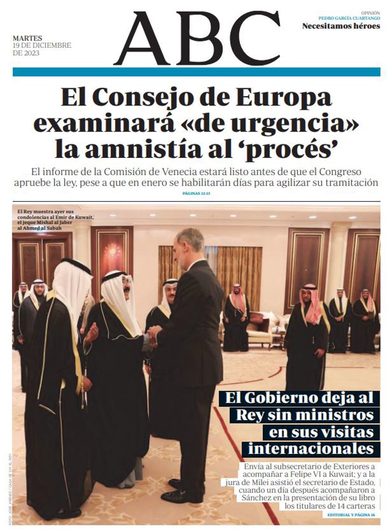 ABC: "El Consejo de Europa examinará "de urgencia" la amnistía al 'procés'. El informe de la Comisión de Venecia estará listo antes de que el Congreso apruebe la ley, pese a que en enero se habilitarán días para agilizar su tramitación"; "El Gobierno deja al Rey sin ministros en sus visitas internacionales".