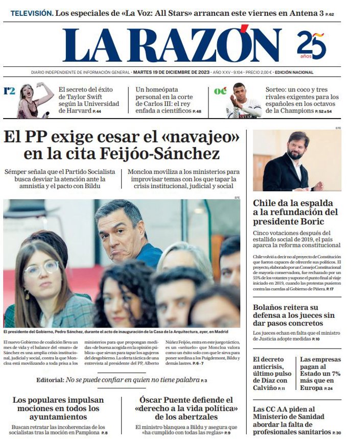 LA RAZÓN: "El PP exige cesar el "navajeo" en la cita Feijóo-Sánchez"; "Los populares impulsan mociones en todos los ayuntamientos"; "Óscar Puente defiende el "derecho a la vida política" de los abertzales"; "Chile da la espalda a la refundación del presidente Boric".