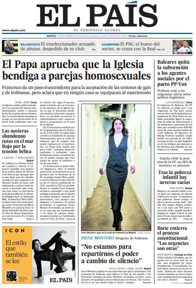 EL PAÍS: "El Papa aprueba que la Iglesia bendiga a parejas homosexuales"; "Las navieras abandonan rutas en el mar Rojo por la tensión bélica"; "Irene Montero, dirigente de Podemos: "No estamos para repartirnos el poder a cambio de silencio""; "Baleares quita la subvención a los agentes sociales por el pacto PP-Vox"; "Tras la pobreza infantil hay neveras vacías"; "Boric entierra el proceso constitucional: "Las urgencias son otras"".