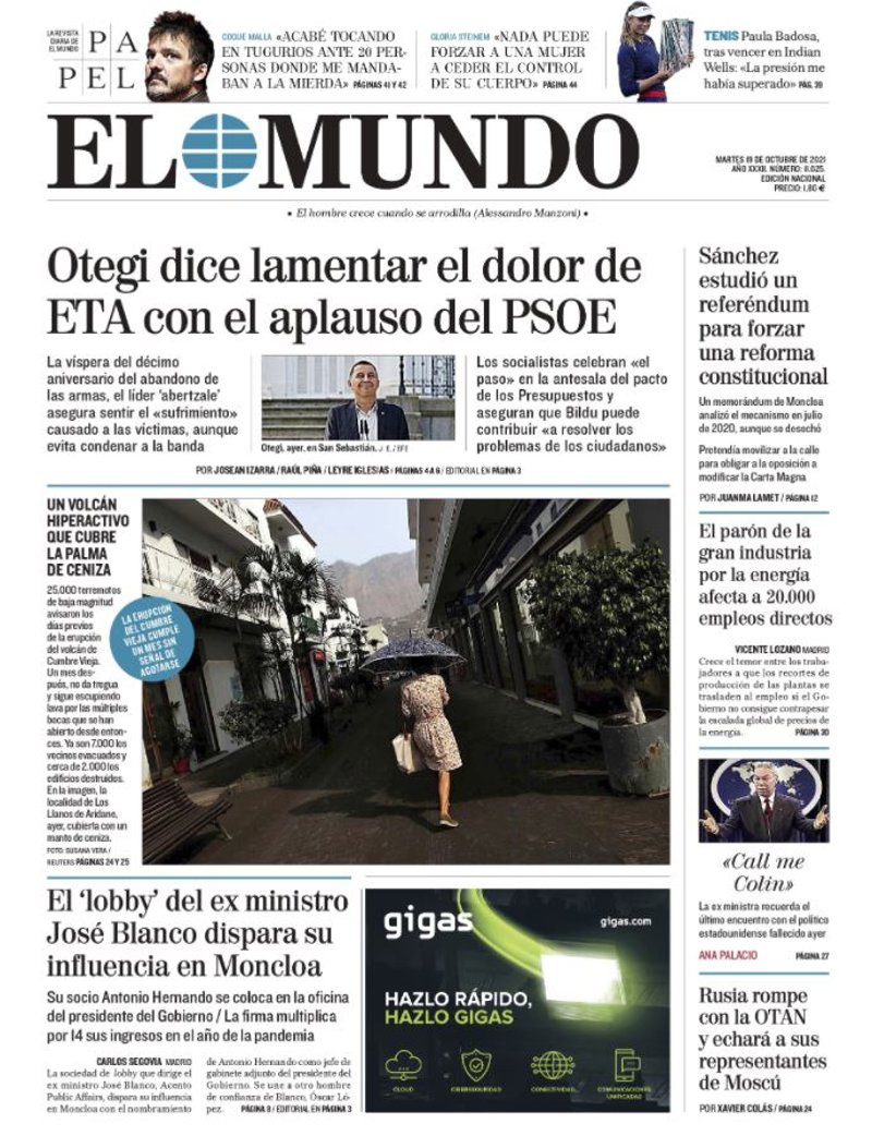EL MUNDO: "Otegi dice lamentar el dolor de ETA con el aplauso del PSOE"; "Sánchez estudió un referéndum para forzar una reforma constitucional"; "El 'lobby' del ex ministro José Blanco dispara su influencia en Moncloa"; "Rusia rompe con la OTAN y echará a sus representantes de Moscú"; "Un volcán hiperactivo que cubre La Palma de ceniza".