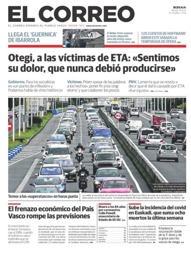 EL CORREO: "Otegi, a las víctimas de ETA: 'Sentimos su dolor, que nunca debió producirse'"; "El frenazo económico del País Vasco rompe las previsiones"; "Muere a los 84 años por coronavirus Colin Powell, exsecretario de Estado de EEUU"; "Sube la incidencia del covid en Euskadi, que suma ocho muertos la última semana".