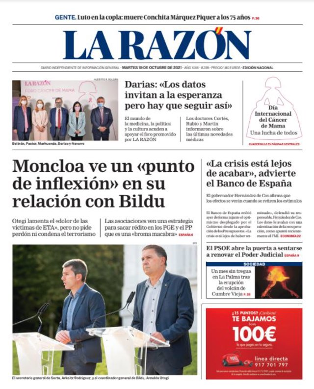 LA RAZÓN: "Moncloa ve un 'punto de inflexión' en su relación con Bildu"; "'La crisis está lejos de acabar', advierte el Banco de España"; "Darias: 'Los datos invitan a la esperanza pero hay que seguir así'"; "El PSOE abre la puerta a sentarse a renovar el Poder Judicial".