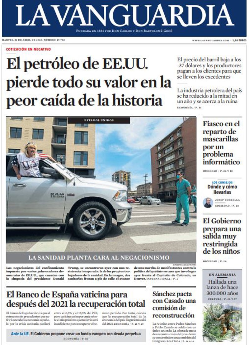 LA VANGUARDIA: "El petróleo de EE UU pierde todo su valor en la peor caída de la historia"; "El Banco de España vaticina para después del 2021 la recuperación total"; "Sánchez pacta con Casado una comisión de reconstrucción"; "Fiasco en el reparto de mascarillas por un problema informático"; "El Gobierno prepara una salida muy restringida de los niños".