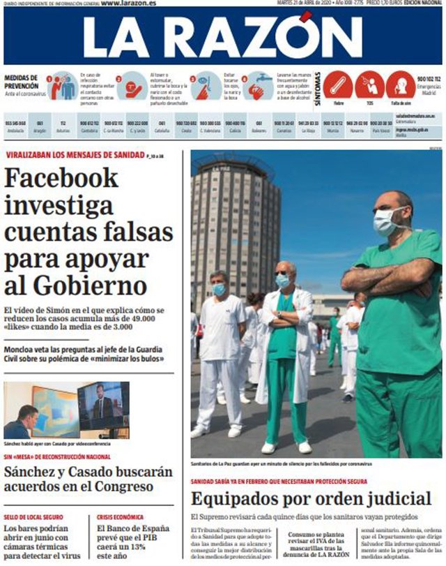 LA RAZÓN: "Facebook investiga cuentas falsas para apoyar al Gobierno"; "Sánchez y Casado buscarán acuerdos en el Congreso"; "Equipados por orden judicial"; "Los bares podrían abrir en junio con cámaras térmicas para detectar el virus"; "El Banco de España prevé que el PIB caerá un 13% este año".