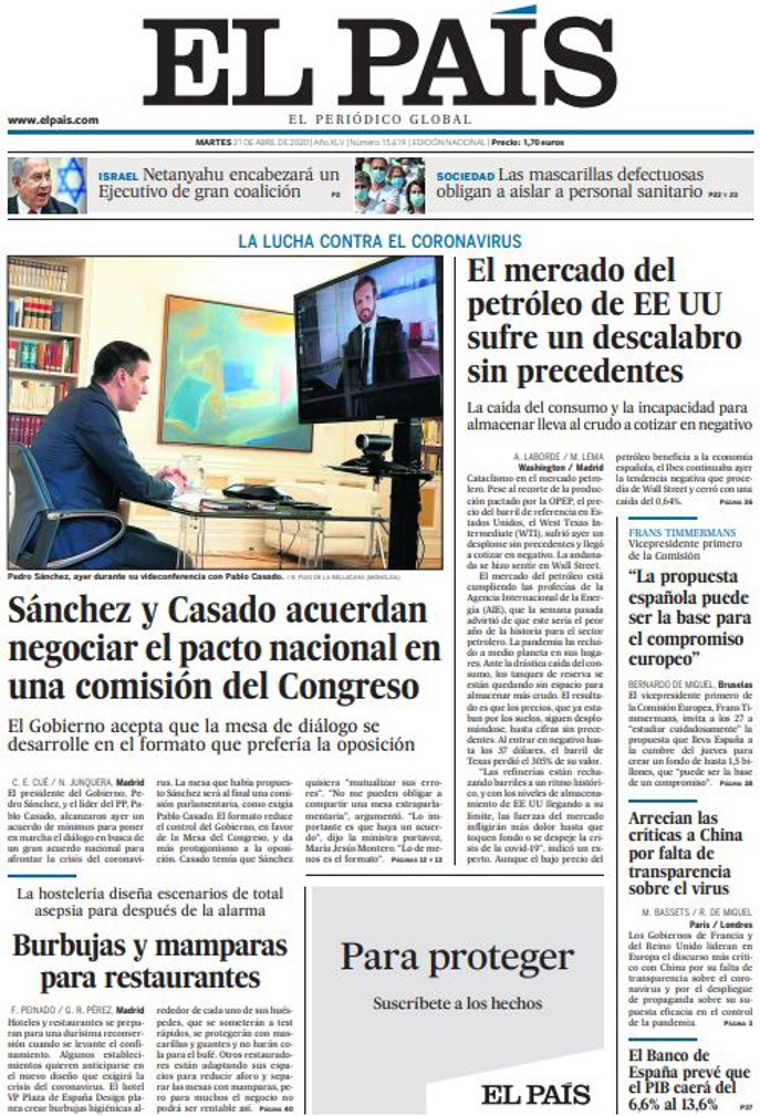 EL PAÍS: "Sánchez y Casado acuerdan negociar el pacto nacional en una comisión del Congreso"; "El mercado del petróleo de EE UU sufre un descalabro sin precedentes"; "Burbujas y mamparas para restaurantes"; "Frans Timmermans, vicepresidente primero de la Comisión: "La propuesta española puede ser la base para el compromiso europeo"; "Arrecian las críticas a China por falta de transparencia sobre el virus"; "El Banco de España prevé que el PIB caerá del 6,6% al 13,6%".
