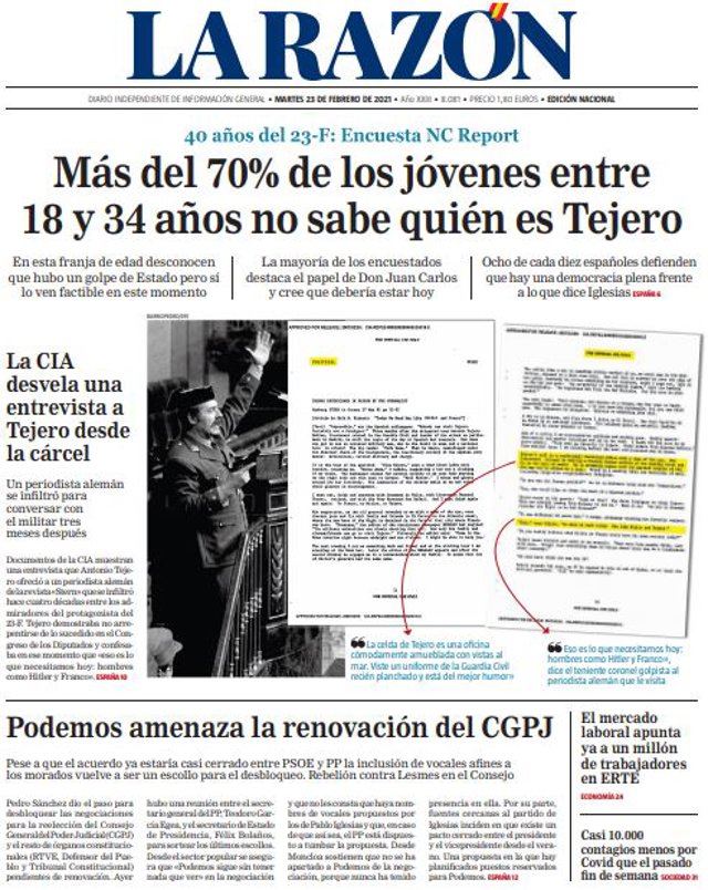 LA RAZÓN: "Más del 70% de los jóvenes entre 18 y 34 años no sabe quién es Tejero"; "La CIA desvela una entrevista a Tejero desde la cárcel"; "Podemos amenaza la renovación del CGPJ"; "El mercado laboral apunta ya a un millón de trabajadores en ERTE"; "Casi 10.000 contagios menos por Covid que el pasado fin de semana".