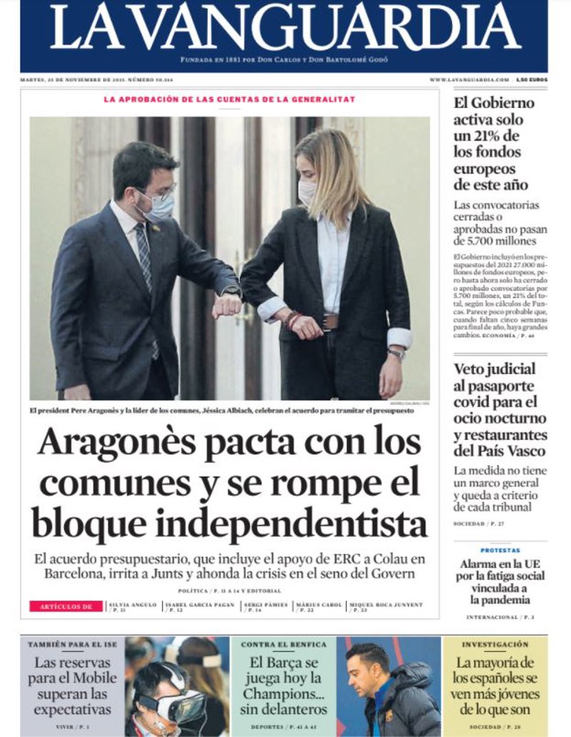 LA VANGUARDIA: "Aragonès pacta con los comunes y se rompe el bloque independentista"; "El Gobierno activa solo un 21% de los fondos europeos de este año"; "Veto judicial al pasaporte covid para el ocio nocturno y restaurantes del País Vasco"; "Alarma en la UE por la fatiga social vinculada a la pandemia"; "Las reservas para el Mobile superan las expectativas"; "El Barça se juega hoy la Champions... sin delanteros".
