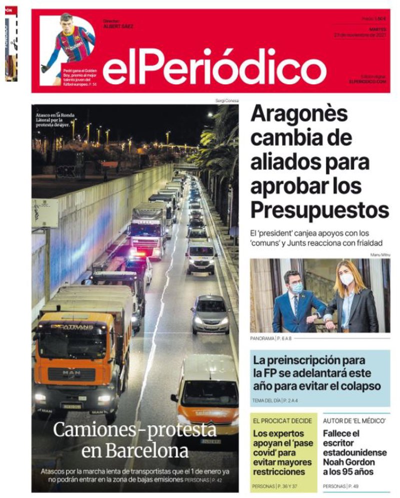EL PERIÓDICO: "Camiones-protesta en Barcelona"; "Aragonès cambia de aliados para aprobar los Presupuestos"; "La preinscripción para la FP se adelantará este año para evitar el colapso"; "Los expertos apoyan el 'pase covid' para evitar mayores restricciones"; "Fallece el escritor estadounidense Noah Gordon a los 95 años".