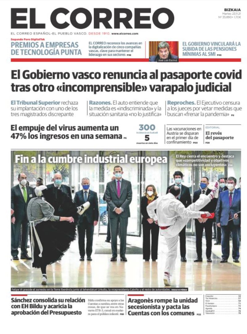 EL CORREO: "El Gobierno vasco renuncia al pasaporte covid tras otro 'incomprensible' varapalo judicial"; "El empuje del virus aumenta un 47% los ingresos en una semana"; "Fin a la cumbre industrial europea"; "Sánchez consolida su relación con EH Bildu y acaricia la aprobación del Presupuesto"; "Aragonès rompe la unidad secesionista y pacta las Cuentas con los comunes".