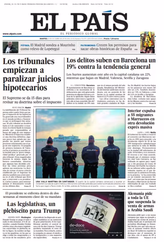 EL PAÍS: "Los tribunales empiezan a paralizar juicios hipotecarios"; "Los delitos suben en Barcelona un 19% contra la tendencia general"; "Interior expulsa a 55 migrantes a Marruecos en otra devolución exprés masiva"; "Las legislativas, un plebiscito para Trump".