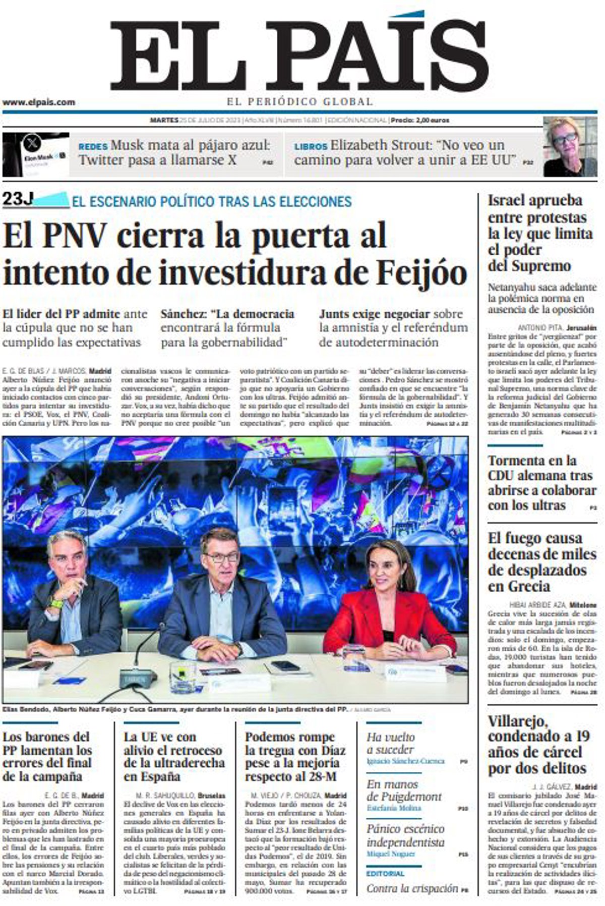 EL PAÍS: "El PNV cierra la puerta al intento de investidura de Feijóo"; "Los barones del PP lamentan los errores del final de la campaña"; "La UE ve con alivio el retroceso de la ultraderecha en España"; "Podemos rompe la tregua con Díaz pese a la mejoría respecto al 28-M"; "Israel aprueba entre protestas la ley que limita el poder del Supremo"; "Tormenta en la CDU alemana tras abrirse a colaborar con los ultras"; "El fuego causa decenas de miles de desplazados en Grecia"; "Villarejo, condenado a 19 años de cárcel por dos delitos".