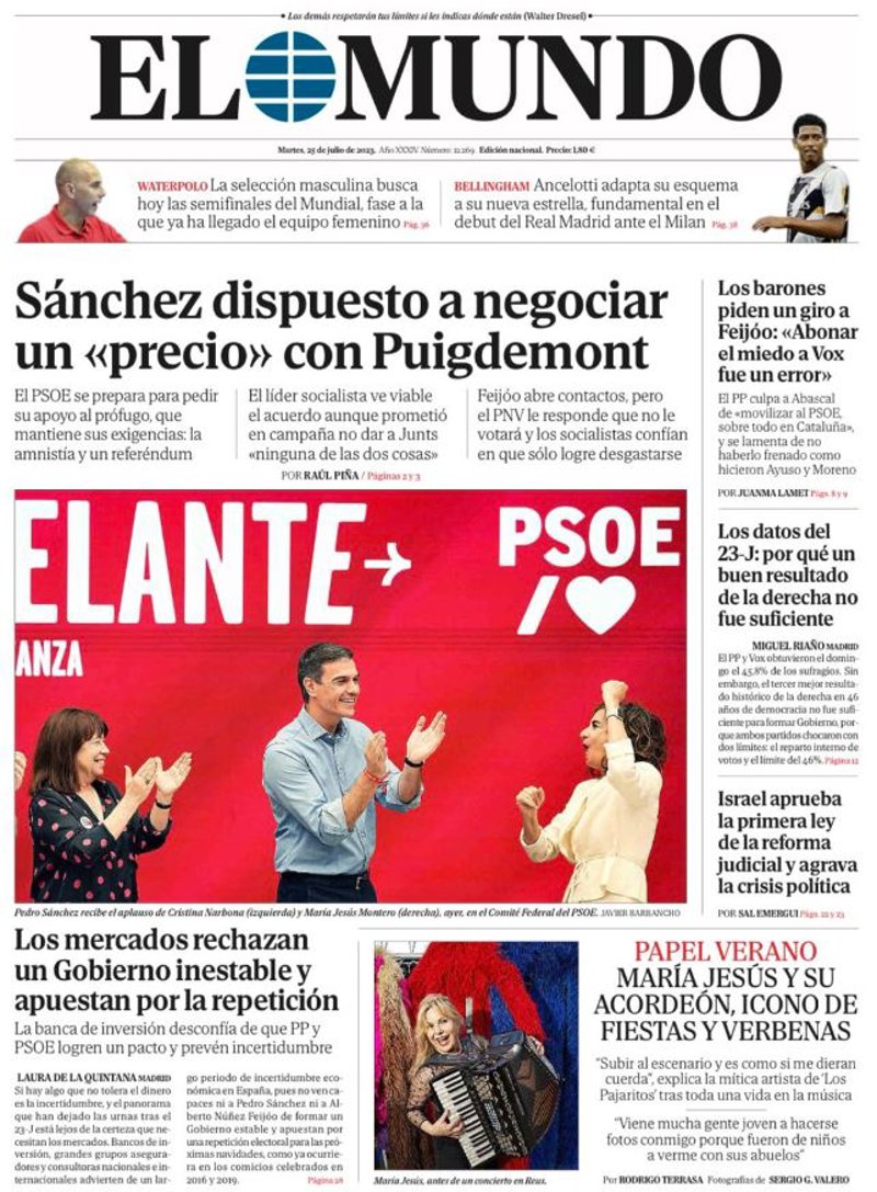 EL MUNDO: "Sánchez dispuesto a negociar un "precio" con Puigdemont"; "Los mercados rechazan un Gobierno inestable y apuestan por la repetición"; "Los barones piden un giro a Feijóo: "Abonar el miedo a Vox fue un error"; "Los datos del 23J: por qué un buen resultado de la derecha no fue suficiente"; "Israel aprueba la primera ley de la reforma judicial y agrava la crisis política".